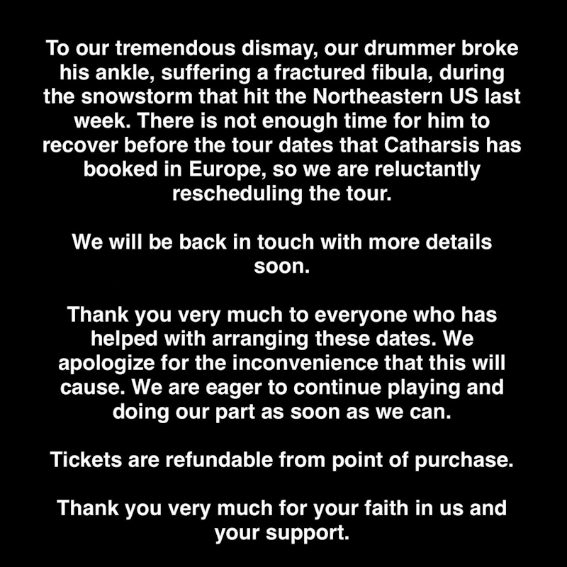 Είμαστε στη δυσάρεστη θέση να ανακοινώσουμε ότι το λάιβ των Catharsis, ένα live που περιμέναμε ίσως περισσότερο από όλα, ακυρώνεται. Δυστυχώς ο drummer της μπάντας Alexei υπέστη κάταγμα περόνης κατά τη διάρκεια της χιονοθύελλας που έπληξε τη βορειοανατολική ακτή την προηγούμενη εβδομάδα, και οι προσπάθειες της μπάντας να βρουν αντικαταστάτη σε τόσο μικρό χρονικό διάστημα μέχρι το ξεκίνημα της Ευρωπαϊκής τους περιοδείας στις 19/03 απέβησαν άκαρπες. Η πρόθεση της μπάντας, του agency αλλά ασφαλώς και η δική μας για reschedule από το φθινόπωρο είναι δεδομένη και θα δουλέψουμε για αυτό.